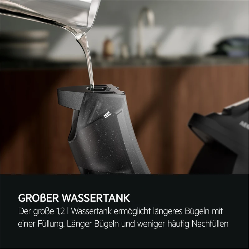 این دستگاه دارای مخزن آب 1.2 لیتری است که امکان اتوکشی طولانی بدون نیاز به پرکردن مجدد آب را فراهم می‌کند. همچنین وجود کارتریج ضد رسوب و برس مخصوص تمیزکاری عمر دستگاه را افزایش داده و از افت عملکرد بخار جلوگیری می‌کند. این سیستم برای مناطق با آب سخت بسیار ضروری است و باعث می‌شود دستگاه سال‌ها بدون مشکل کار کند.