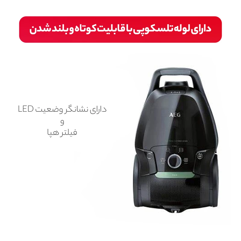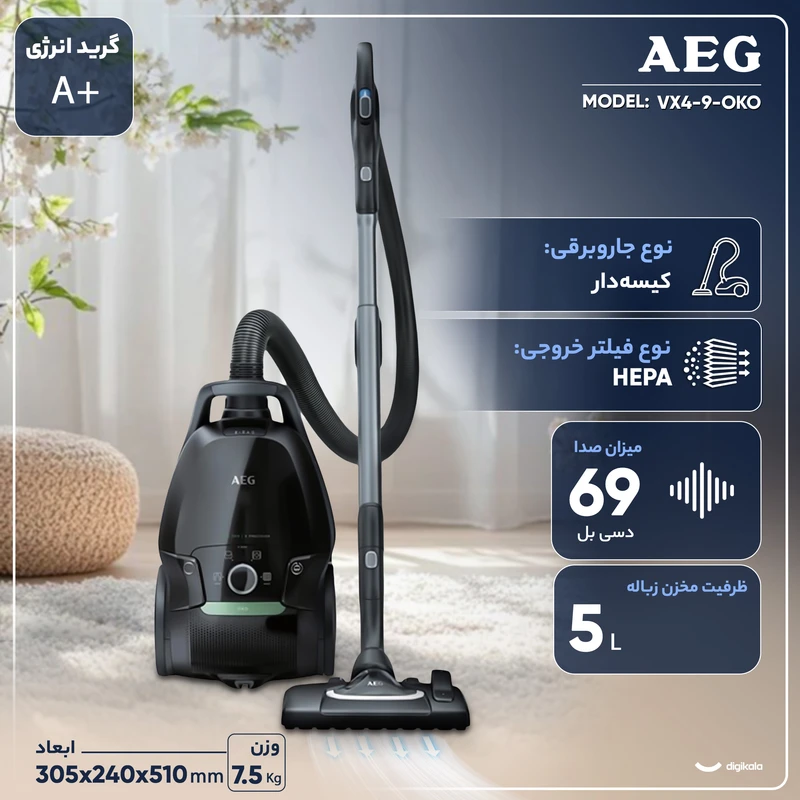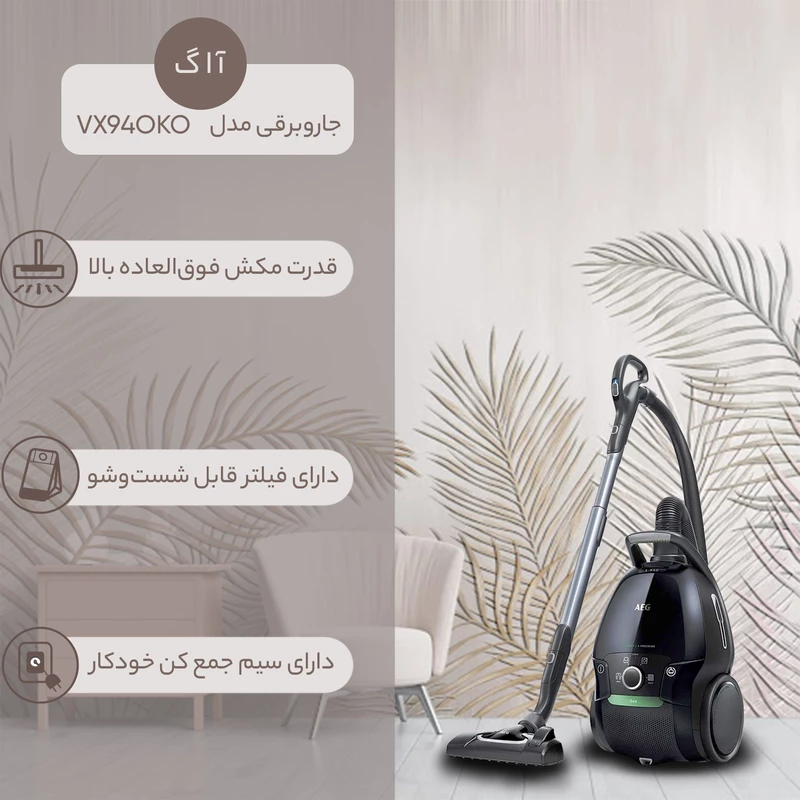 جاروبرقی آ.ا.گ VX9-4-OKO، فیلتر HEPA، کیسه قابل شستشو با ظرفیت ۵ لیتر و امکانات ارگونومیک، گزینه‌ای مناسب برای استفاده خانگی و تمیزکاری روزمره است. طراحی مقاوم و سبک، امکان قرارگیری عمودی و افقی و سری‌های متنوع، تجربه کاربری روان و راحتی را فراهم کرده و فرآیند تمیزکاری را آسان می‌کند. اگر به دنبال جاروبرقی با مصرف انرژی کم، صدای پایین، نگهداری ساده و امکانات کاربردی هستید، مدل VX9-4-OKO انتخابی مطمئن است. این دستگاه نه تنها کارایی بالا دارد، بلکه با فیلتر HEPA و کیسه قابل شستشو، سلامت محیط خانه و پاکیزگی هوا را نیز تضمین می‌کند و برای خانواده‌هایی که اهمیت زیادی به بهداشت محیط دارند، گزینه‌ای ایده‌آل به شمار می‌رود.