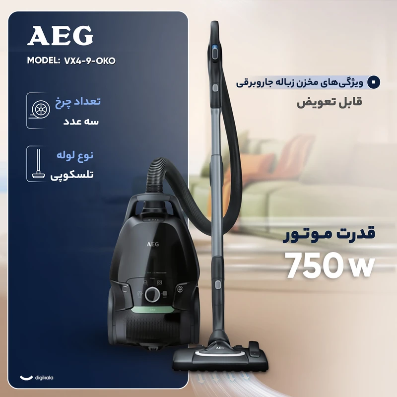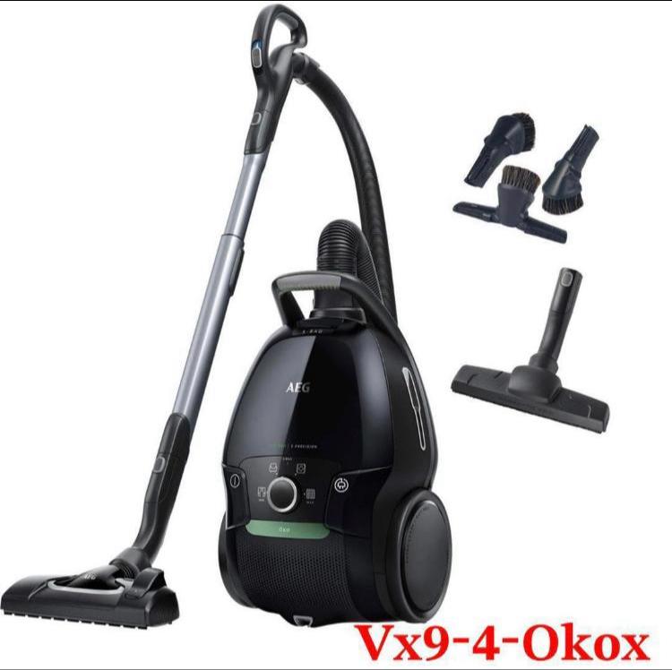 جاروبرقی آاگ مدل VX9-4-OKO یکی از جاروهای نسل جدید کمپانی بزرگ AEG می باشد که کیفیت ساخت بالایی دارد و یکی از محبوب ترین سری جاروهای آاگ هست. از نظر ساخت بدنه این مدل جارو، از مواد بسیار با کیفیت و قابل بازیافت تهیه شده است که 55٪ سازگار با محیط زیست می باشد. دارای یک محافظ صوتی خاص می باشد که باعث تولید نویز بسیار کمی شده که در حدود 69 دسی بل است. از این بابت خیالتان راحت باشد که مزاحمتی برای کسانی که در منزل خوابیده اند ایجاد نخواهد کرد. جاروبرقی آ ا گ مدل VX9-4-OKO با توان مصرفی 750 وات در مقایسه با جاروبرقی‌های معمولی با 2200 وات 75٪ انرژی کمتری استفاده می کند و با وجود توان مصرفی کمتر بازدهی بالایی هم رده با جاروبرقی های 2200 واتی دارد. همین توان مصرفی پایین و توان بازدهی بالا باعث می شود که موتور گرمای کمتری تولید کرده و همین باعث طول عمر بیشتر می شود و به مرور زمان توان مکشی این جاروبرقی افت نخواهد کرد. این جاروبرقی آاگ دارای سیم بلند و شعاع عملکرد 12 متری می باشد که راحتی را در هنگام جارو کشیدن منزل برایتان به ارمغان میاورد. از نظر فیلتراسیون جارو برقی آاگ دارای سه لایه فیلتر کاملا ضد آلرژيک می باشد که 99.9٪ از پخش شدن گرد و غبار در محیط جلوگیری کرده که مناسب افرادی که انواع بیماریهای آلرژیک دارند می باشد. یکی دیگر از مزیتهای این مدل جاروبرقی داشتن چراغ نشانگر کثیفی فیلتر می باشد که معمولا سایر برندها همچین امکانی ندارند. این نشانگر این امکان را به شما می دهد که به موقع فیلتر جاروبرقی را تعویض نمایید و از بار اضافی تحمیل شده به موتور جاروبرقی در اثر کثیفی فیلتر جلوگیری کنید. این جاروبرقی دارای یک سری 3in1 برای پرده، گوشه و کنار و مبلمان و دارای یک پارویی مخصوص پارکت می باشد.