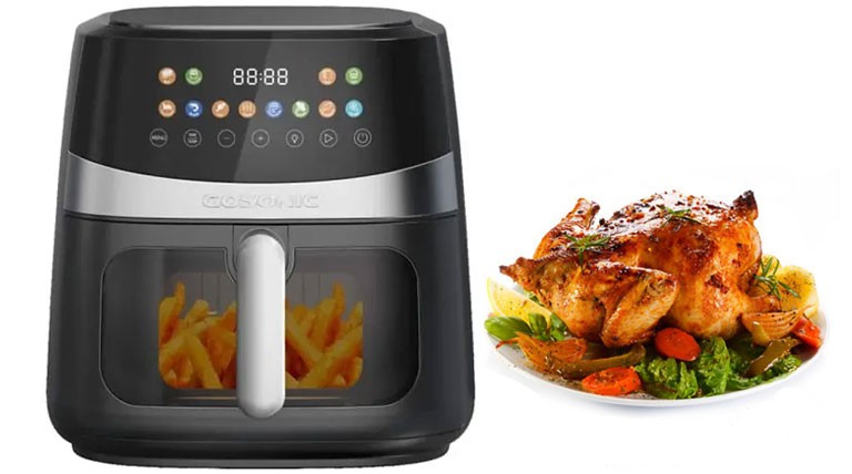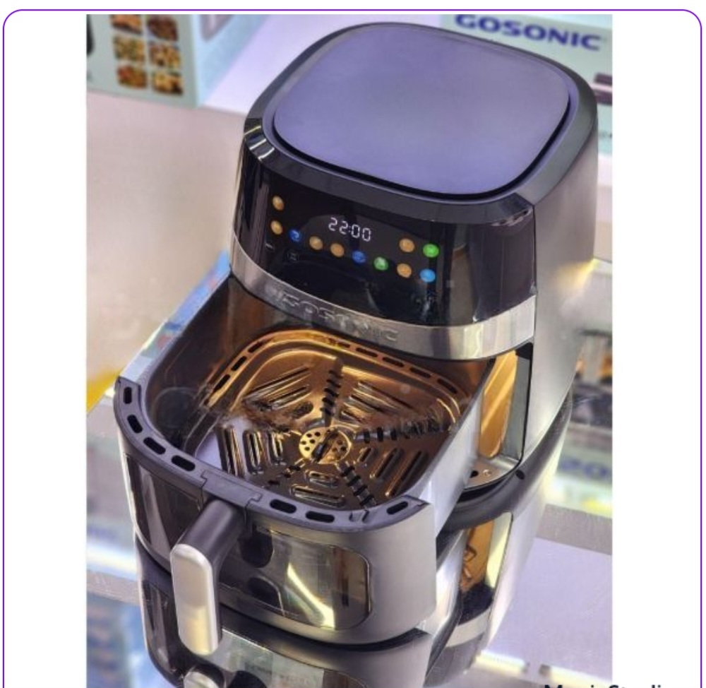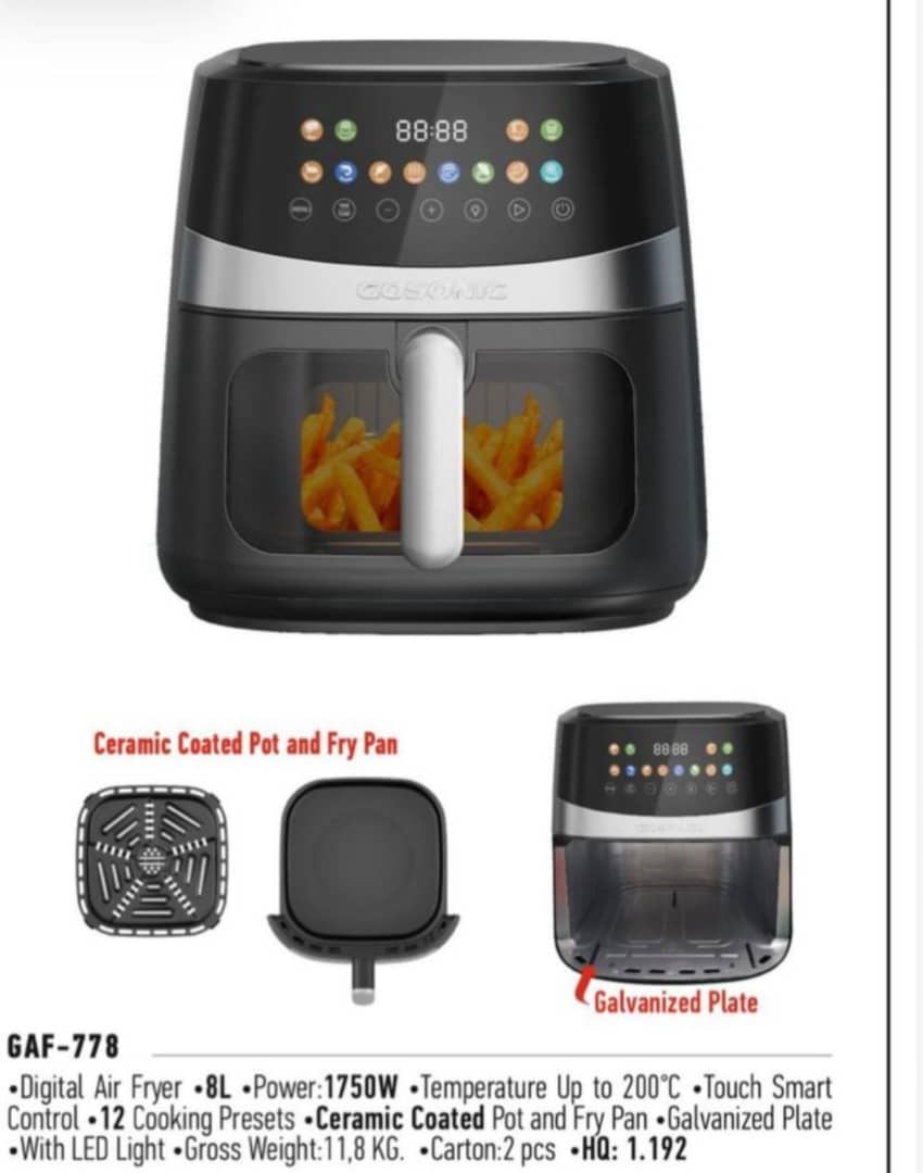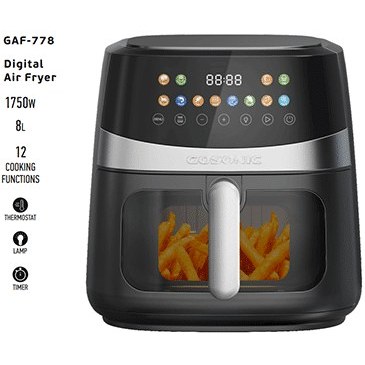 سرخ کن بدون روغن دیجیتال گوسونیک GAF-778 دارای سیستم تایمر و تنظیم دما است که قابلیتهای پر کاربردی میباشند. به کمک 12 برنامه پخت از پیش تعیین شده میتوانید غذاهای لذیذ را در کوتاهترین زمان آماده کنید. این سرخ کن یکی از محصولات بینظیر با طراحی منحصر به فرد و ساخت 2025 از کمپانی گوسونیک است که سبب کاهش ۸۰ درصدی مصرف روغن شده و غذاها را با میزان مصرف بسیار پایین یا بدون روغن سالم آماده میکند. این سرخ کن از گوسونیک دارای توان مصرفی 1750 وات است و در سیستم حرارتی آن از جدیدترین و بهترین المنت های طلایی به کار گرفته شده است. گنجایش مخزن این سرخ کن 8 لیتر است. پنل کنترلی این دستگاه به صورت لمسی طراحی شده است و با یک لمس غذاهای مورد علاقهی شما را آماده میکند. با این سرخکن میتوانید انواع غذا ها مانند؛ گوشت و ماهی کبابی، مرغ و میگوی سوخاری، سیب زمینی سرخ شده، قارچ خوشمزه، بخارپز کردن سبزیجات و … را آماده کنید و همچنین انواع غذای منجمد را گرم نمایید.