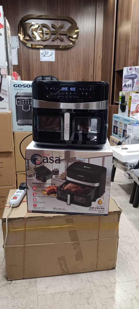 سرخ کن دو قلو ۴ المنته از برند سوپر کاسا، دارای دو المنت در قسمت بالا و دو المنت در پایین سبد سرخ کن، ظرف داخلی از جنس گرانیت مقاوم در برابر حرارت و چسبندگی مواد غذایی، دارای ده برنامه پخت متنوع شامل: پیش گرم کردن، سیب زمینی سرخ کرده، مرغ، گوشت، کیک، میگو، ماهی، پیتزا، سبزیجات، بو دادن مغزیجات، قابیلت تنظیم دما و زمان هر سبد بصورت مجزا، قابلیت تنظیم یکدست دو سبد با هم، یکی از ویژگی های این محصول برنامه Smart Finish میباشد که به شما این امکان را میدهد دو برنامه پخت متنوع را انتخاب کنید اما با انتخاب این گزینه هر دو پخت را با هم تمام کند (یعنی اگر یک برنامه زمان پخت کمتری داشته باشد با برنامه دیگر که زمان پخت بیشتری دارد را همزمان تمام میکند)، در قسمت بالا محصول تصویر تمام مواد غذایی با زمان پخت و درجه پخت قرار گرفته است تا براحتی بتوانید زمان و حرارت دلخواه مواد مختلف را انتخاب کنید، تا ۸۰ درصد مصرف کمتر روغن نسبت به سرخ کن های دیگر و حفظ طعم و خواص مواد غذایی، قسمت فضای داخلی محل قرارگیری سبد سرخ کن از جنس گالوانیزه میباشد که در اکثر سرخ کن ها این قسمت پلاستیکی میباشد، طراحی جدید سبد سرخ کن که مراحل پخت قابل مشاهده بوده و دیگر برای مشاهده مراحل پخت نیاز نیست سبد سرخ کن را خارج کنید، دارای لامپ داخلی، طراحی و مهندسی محصول در کشور انگلستان مونتاژ نهایی در کشور چین