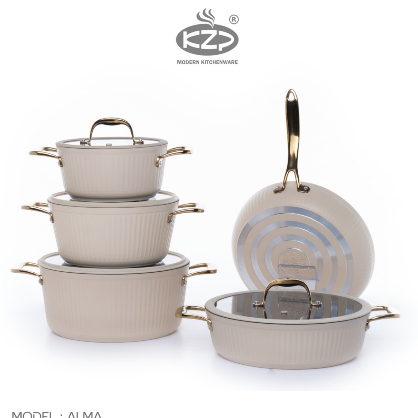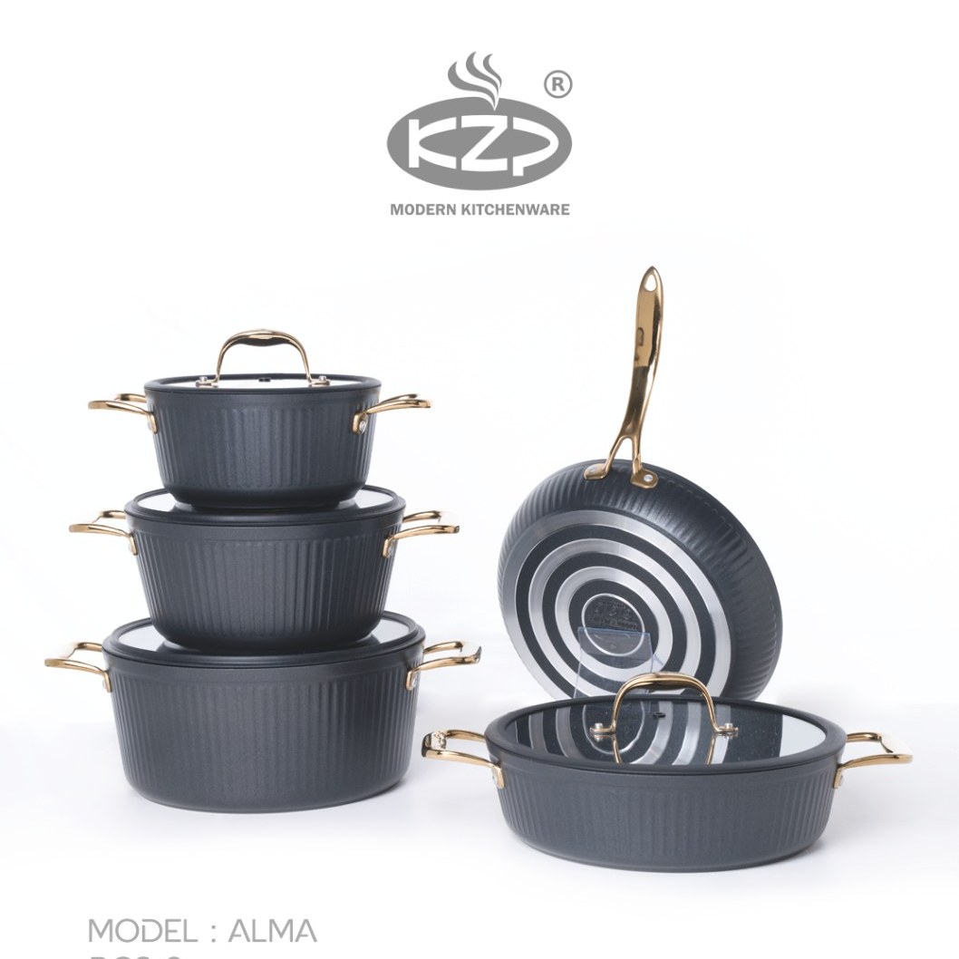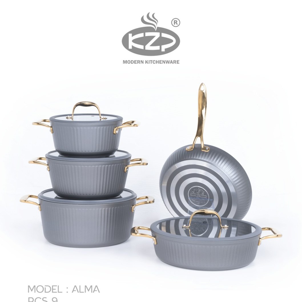 سرویس قابلمه KZP کالکشن آلما ۹ پارچه درب سیلیکونی دستگیره طلایی
