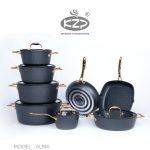 سرویس قابلمه ۱۴ پارچه (KZP) طرح آلما، انتخابی شیک و بادوام برای آشپزخانههای مدرن است. بدنهی چدنی با پوشش گرانیت نچسب و ضخامت ۴ میلیمتری، مقاومت حرارتی بالایی دارد و پخت غذا را با حداقل روغن ممکن میسازد. این سرویس شامل ۵ قابلمه در سایزهای مختلف، سه عدد تابه (تکدسته، دو دسته و گریل) و یک عدد شیرجوش است. دربهای سیلیکونی مقاوم در برابر حرارت و دستگیرههای طلایی طراحی ظاهری زیبایی به آن بخشیدهاند.