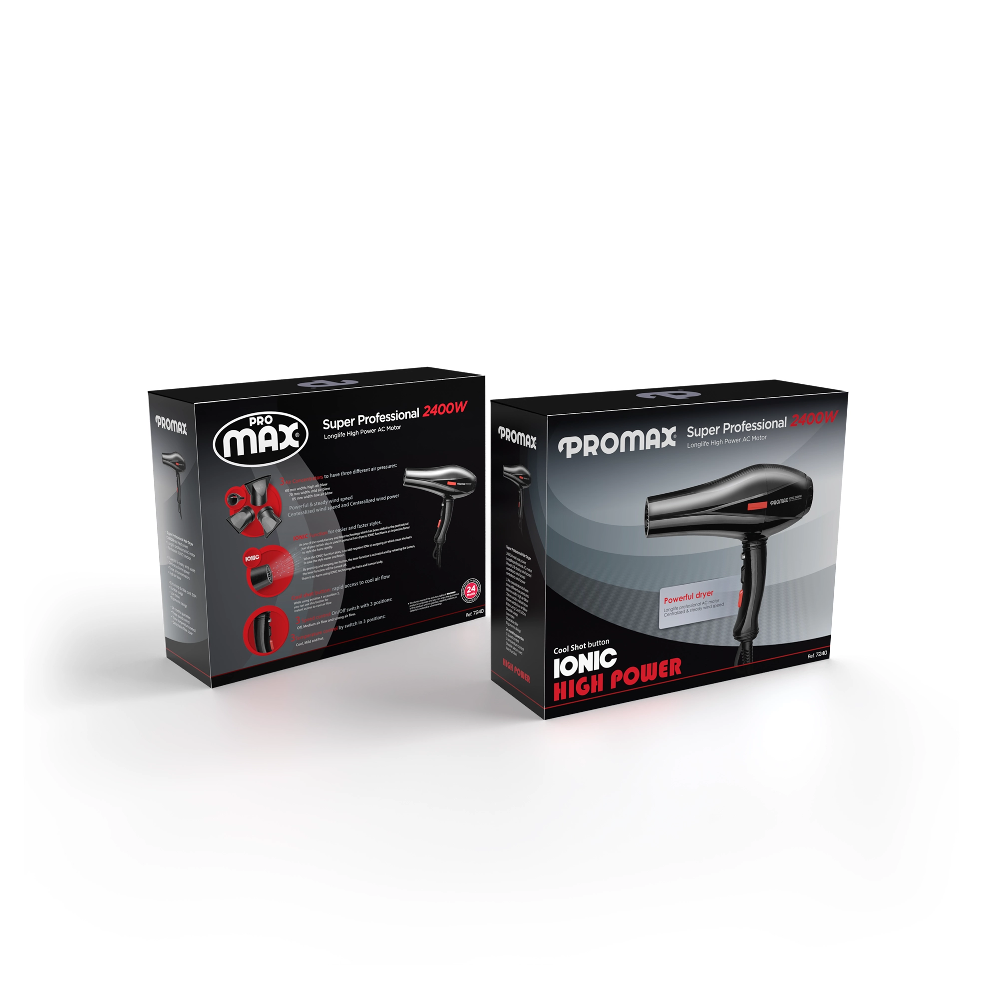 سشوار پرومکس مدل 7240 یک سشوار حرفه ای قدرتمند با موتور AC 2400 وات است. دارای فناوری تولید یون برای تولید یون های منفی و جلوگیری از وز شدن موها می باشد. مجهز به دکمه باد سرد برای تثبیت حالت مو، سه متمرکز کننده هوا با اندازه های مختلف، کنترل دو حالته سرعت (متوسط و زیاد)، و کنترل سه حالته دما (سرد، ملایم و گرم) است. دارای فیلتر هوای قابل جداسازی، سیم 3 متری و حلقه آویز می باشد. با این ویژگی ها، برای استفاده حرفه ای در آرایشگاه ها و خشک کردن و حالت دادن سریع به موها بسیار مناسب است.