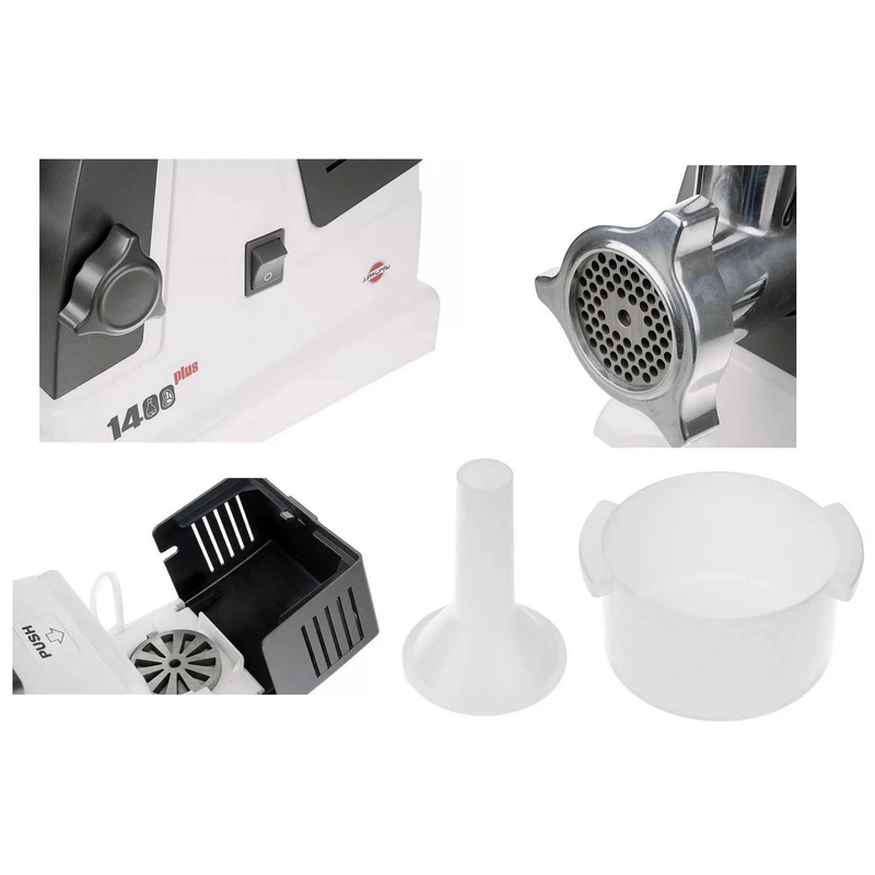 سرعت چرخ کردن گوشت (1200 گرم در دقیقه)، مجهز به موتور پرقدرت 700W، مجهز به کلید دور برگردان موتور (Revers) ، دارای دو عدد شبکه مخصوص خرد كردن گوشت و سبزی، طراحی زیبا با گلویی ایمن مطابق با استاندارد، ظرف پلاستیکی جهت جمع آوری گوشت چرخ شده، دارای قطعه سوسیس ساز، دارای استاندارد ملي ايران (ايمني) ، داراي عایق کاری دوبل قطعات الکتریکی جهت ايمني بيشتر، دارای محفظه نگهداري شبكه گوشت يا سبزي، داراي محفظه نگهداري سيم، داراي سيني بزرگ و جاداربراي سرعت بخشيدن به كار، تنوع رنگي: سفيد/ طوسي، نقره اي/ مشكي، داراي 2 ماه وارانتي، 25 ماه گارانتي، 10 سال تامين قطعات و خدمات پس از فروش